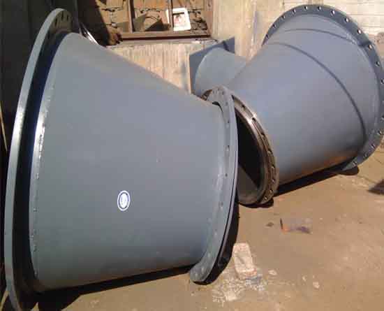 衬胶大小头采用钢管作骨架材料,以耐磨、防腐、耐热等性能优异的橡胶作为衬里层,利用橡胶的高弹性、高气密性、耐冲击性、耐磨性、耐候性、耐辐射性、耐化学介质性和吸收振动等独特性能,使用高性能的粘合剂经特殊工艺复合硫化成型,产品具有高耐磨、耐水锤冲击、耐酸碱盐腐蚀、抗高温、缓结垢、粘接强度高、运行阻力小、输送介质广、使用寿命长、节电节材等优点,减小输送介质对管壁的冲击磨损,应用于冶金、电力、化工、石油、煤炭、水泥等行业的输送温度在-30℃~+150℃之间,既有磨损又有腐蚀的介质的管路设备。